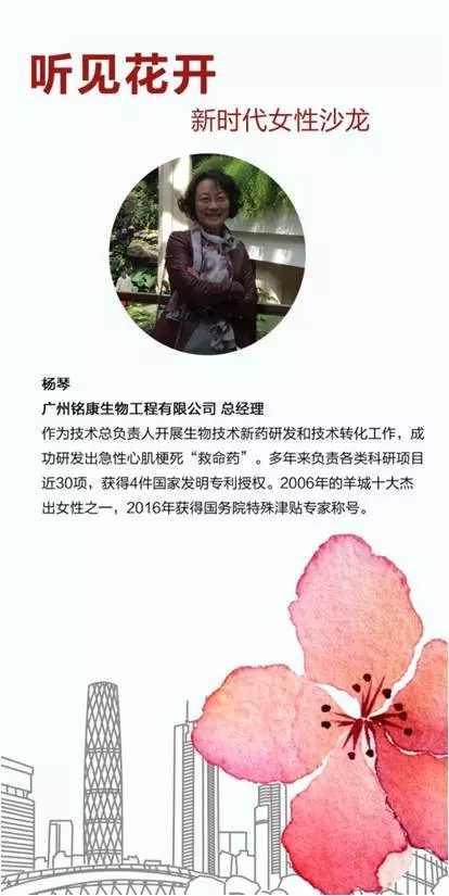 活動現場氣氛熱烈,座無虛席。女企業家們暢所欲言,通過分享創業經歷和感想,以及事業和家庭上的體驗,表達她們對新時代女性的看法和期望。作為嘉賓之一,我司楊琴女士向觀眾道出自己軍人出身創業研發急性心肌梗死藥物銘復樂的初衷:想縮短我國生物技術藥物研究及溶栓治療水平與國際先進水平的差距,也是為了讓我國心腦血管患者能夠用上新型溶栓藥。在“如何創造更利于女性發展的職場”話題中,楊琴女士認為女性的認真細心與堅韌不拔的品質在生物醫藥研發上更能發揮作用。銘復樂作為迄今唯一可單次靜脈推注的溶栓藥,具有使用方便、適合急救,可院外溶栓的顯著優勢,但因其為高難度、高復雜度基因重組藥物的典型代表,必須使用哺乳動物細胞表達生產,研發團隊艱苦研究開發了15年才終于實現銘復樂的產業化并正式上市。在問及心目中最能代表理想女性的花時,楊琴女士回答木棉花,不僅因為它是廣州市市花,更因為《致橡樹》中木棉要以樹的形象與橡樹站在一起,女性就要像木棉一樣,自信自立自強,世界才會更加美好!