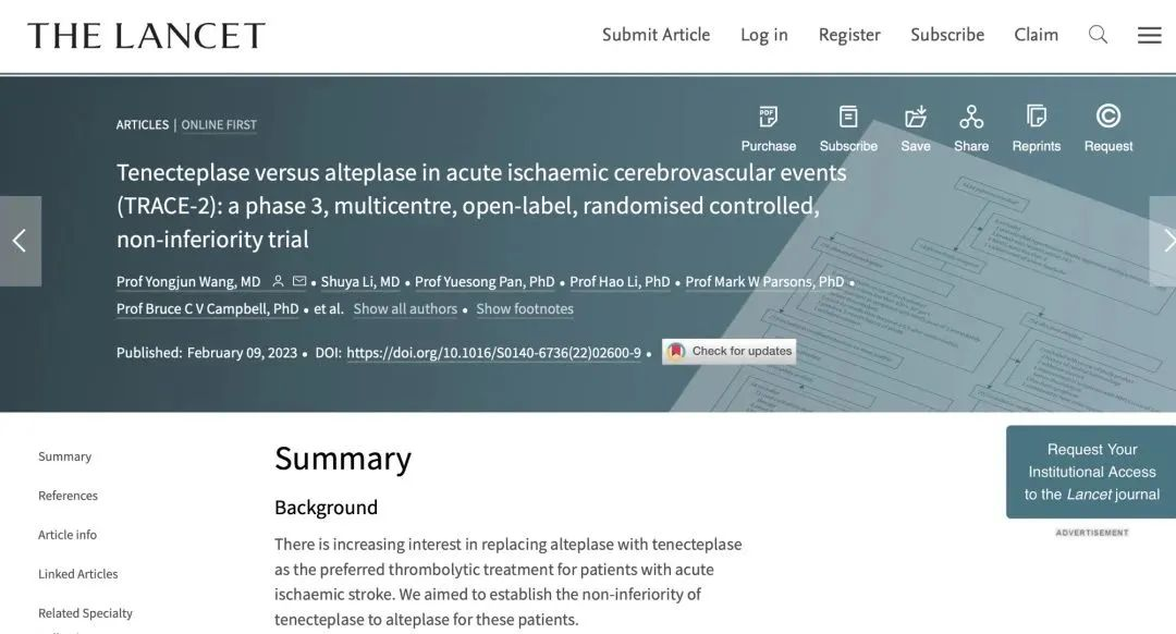 由石藥集團(tuán)明復(fù)樂(lè)藥業(yè)(廣州)有限公司發(fā)起,首都醫(yī)科大學(xué)附屬北京天壇醫(yī)院王擁軍教授領(lǐng)銜,針對(duì)石藥集團(tuán)明復(fù)樂(lè)藥業(yè)創(chuàng)新藥銘復(fù)樂(lè)®(注射用重組人TNK組織型纖溶酶原激活劑,rhTNK-tPA)開(kāi)展的TRACE系列研究再次獲得重磅認(rèn)可。2月9日,其中的TRACE-2研究成果在國(guó)際頂級(jí)權(quán)威醫(yī)學(xué)雜志《柳葉刀》(The Lancet)(IF:202.731)發(fā)表。這是我國(guó)企業(yè)自主知識(shí)產(chǎn)權(quán)的腦血管病藥物首次登上全球頂刊,標(biāo)志著神經(jīng)領(lǐng)域國(guó)產(chǎn)藥物注冊(cè)臨床研究成果開(kāi)始走上國(guó)際舞臺(tái)。