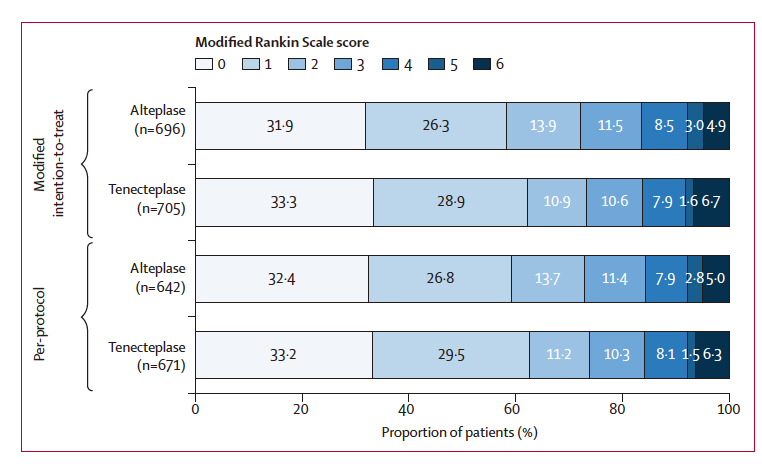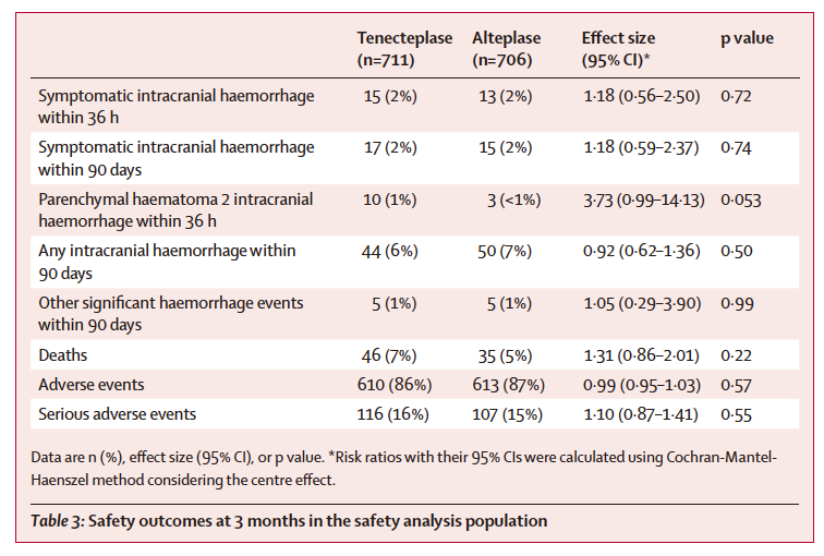 試驗(yàn)結(jié)果顯示,rhTNK-tPA治療組獲得良好功能預(yù)后的(90天mRS評(píng)分0-1分)受試者比例為62%,rt-PA治療組為58%, 兩組差值達(dá)到非劣效。rhTNK-tPA治療組36小時(shí)內(nèi)PH2型顱內(nèi)出血,90天內(nèi)癥狀性顱內(nèi)出血及死亡患者的比例與rt-PA治療組相比無(wú)統(tǒng)計(jì)學(xué)差異。