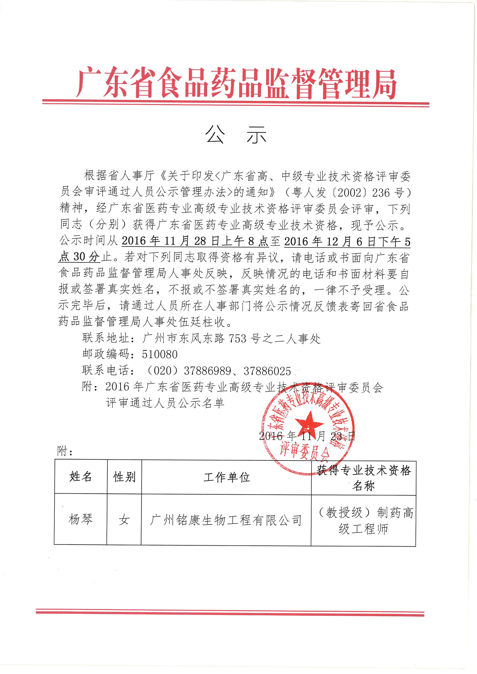 關于楊琴同志獲得廣東省(教授級)制藥高級工程師專業技術資格的公示